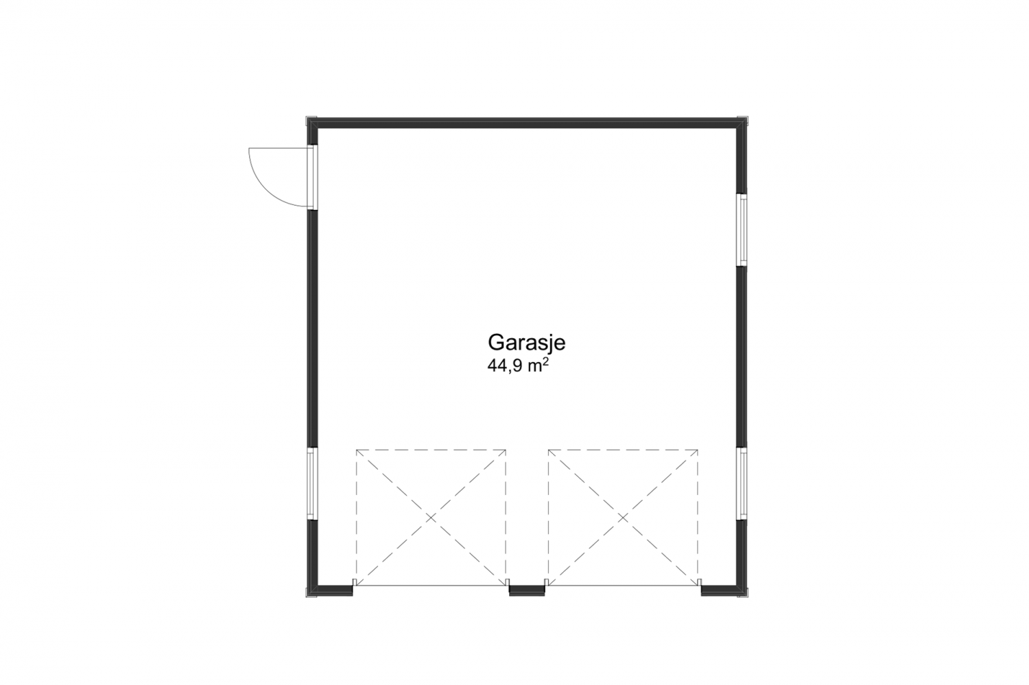 Med doble garasjeporter og valmet tak, er dette en garasje for deg som ønsker et bygg med herskapelig uttrykk ved boligen din. Med sine nesten 45m2 har denne garasjen både plass til to personbiler, og alt annet du måtte ønske å lagre i garasjen.